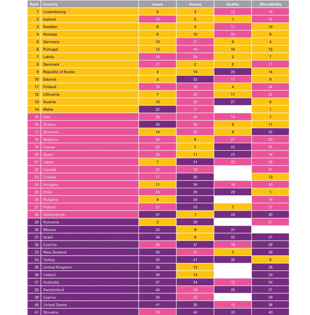 The report assesses the countries on the amount of leave offered to new parents, the ease of access to education in early childhood, the quality of teaching and the affordability of childcare.